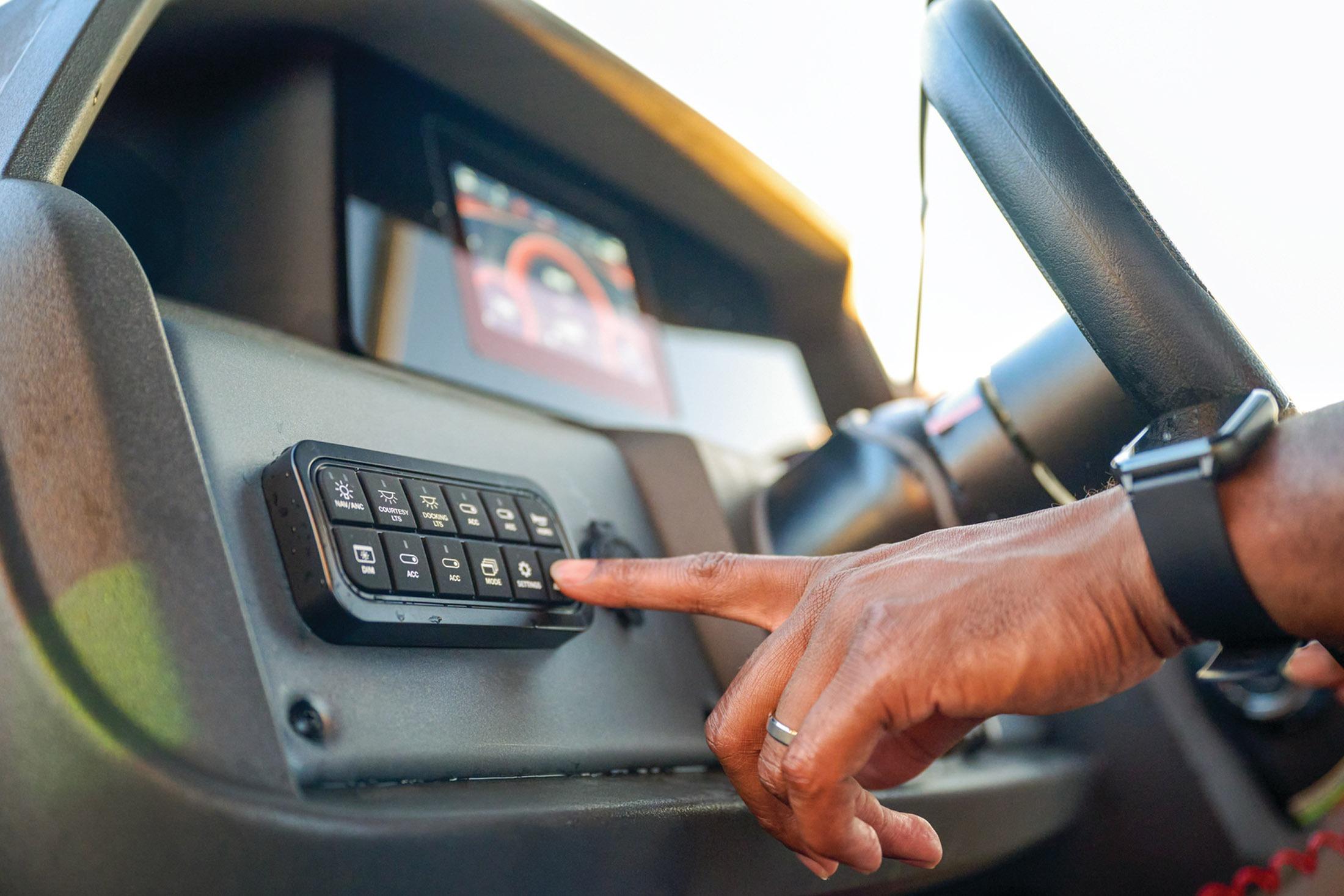 Driver console w/integrated storage, drink holders, built-in footrest & ergonomically-positioned controls