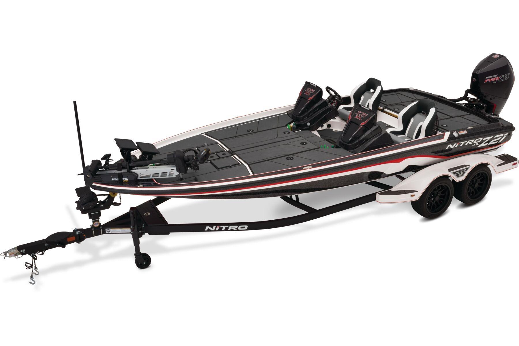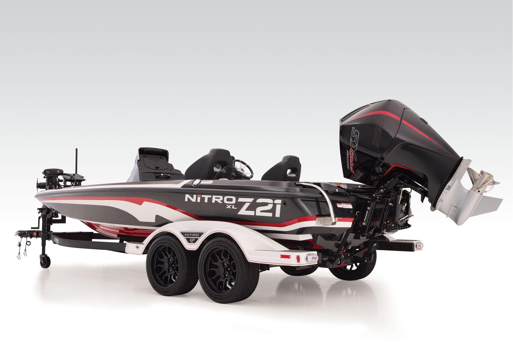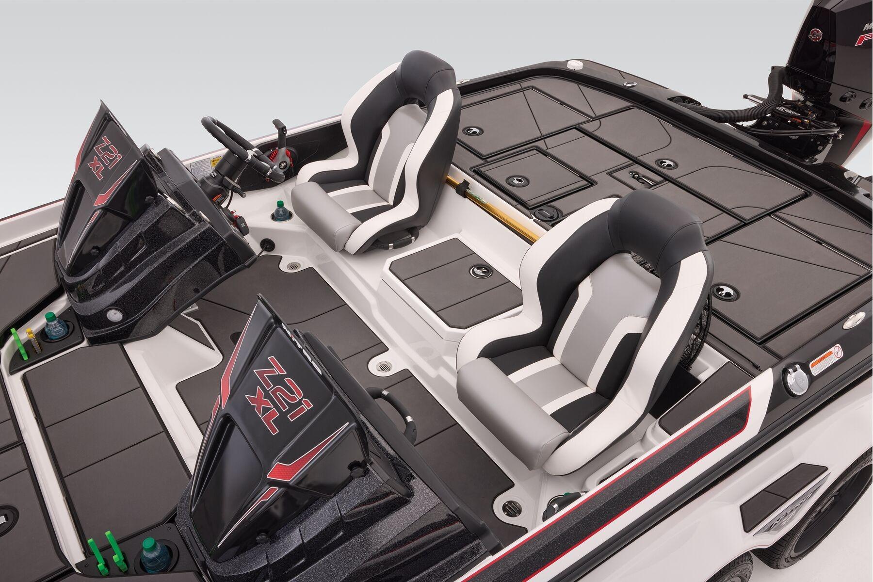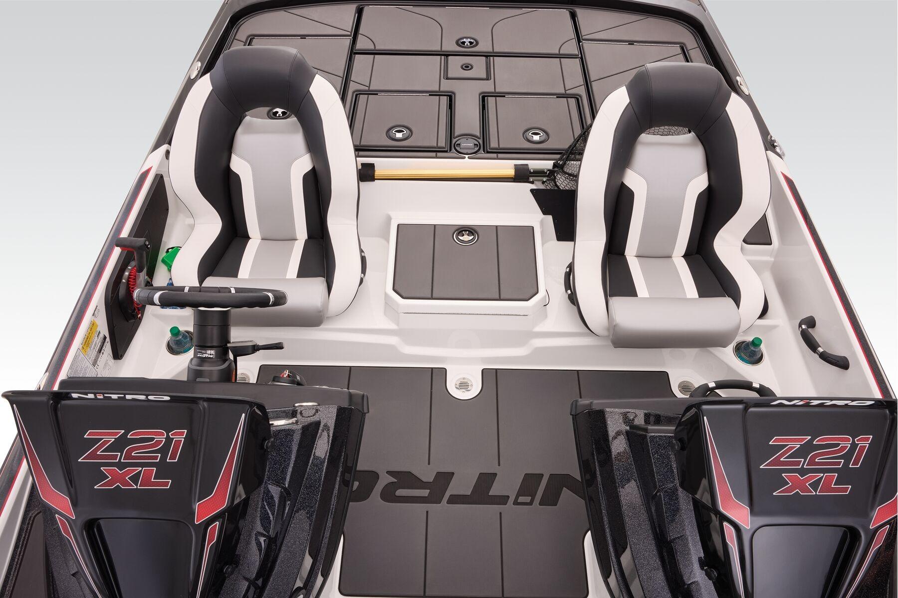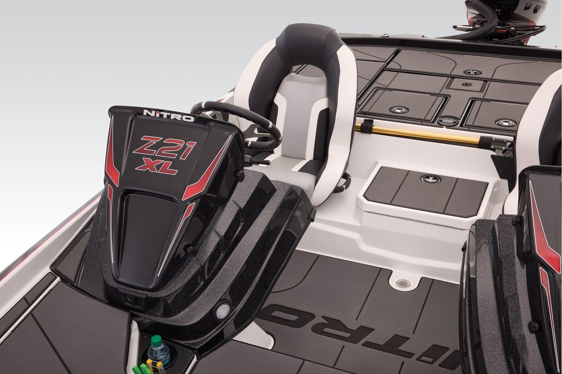Sports car performance, sedan comfort, SUV utility. The NITRO® Z21 XL combines these and more into the ultimate no-holds-barred bassin’ rig. In the 21-foot class, the Z21 XL stands alone in performance-driven fishability with a colossal casting deck, pro-driven layout, and all the fishing features demanded by the top pros. Up front, an extra-wide bow gives you more stability on the trolling motor, and you’ll be at your best all day thanks to the padded front deck. The colossal center stows carry both rods and tackle in organized security and are accessible at a moment’s notice. All-new slam latches mean no more twist latches to trip over when left undone. Underfoot in the cockpit is an EVA foam pad for fast-drying non-skid grip, while the helm is an angler’s dream, carrying electronics up to 16”, a full gauge set, and the NITRO® Z-TOUCH™ touchscreen control center. Z-CORE™ suspension seating saves your back in chop and keeps you centered in high-performance turns thanks to the side-bolstered design. The running surface of the Z21 XL features NVT™ technology for instant planing, nimble handling, and superior speeds with a full load. Our engineers focused on real-world tournament conditions to deliver a better experience with a full load, fishing partner, full livewells, and a full complement of gear to give you the pro-grade experience you’ve been looking for.