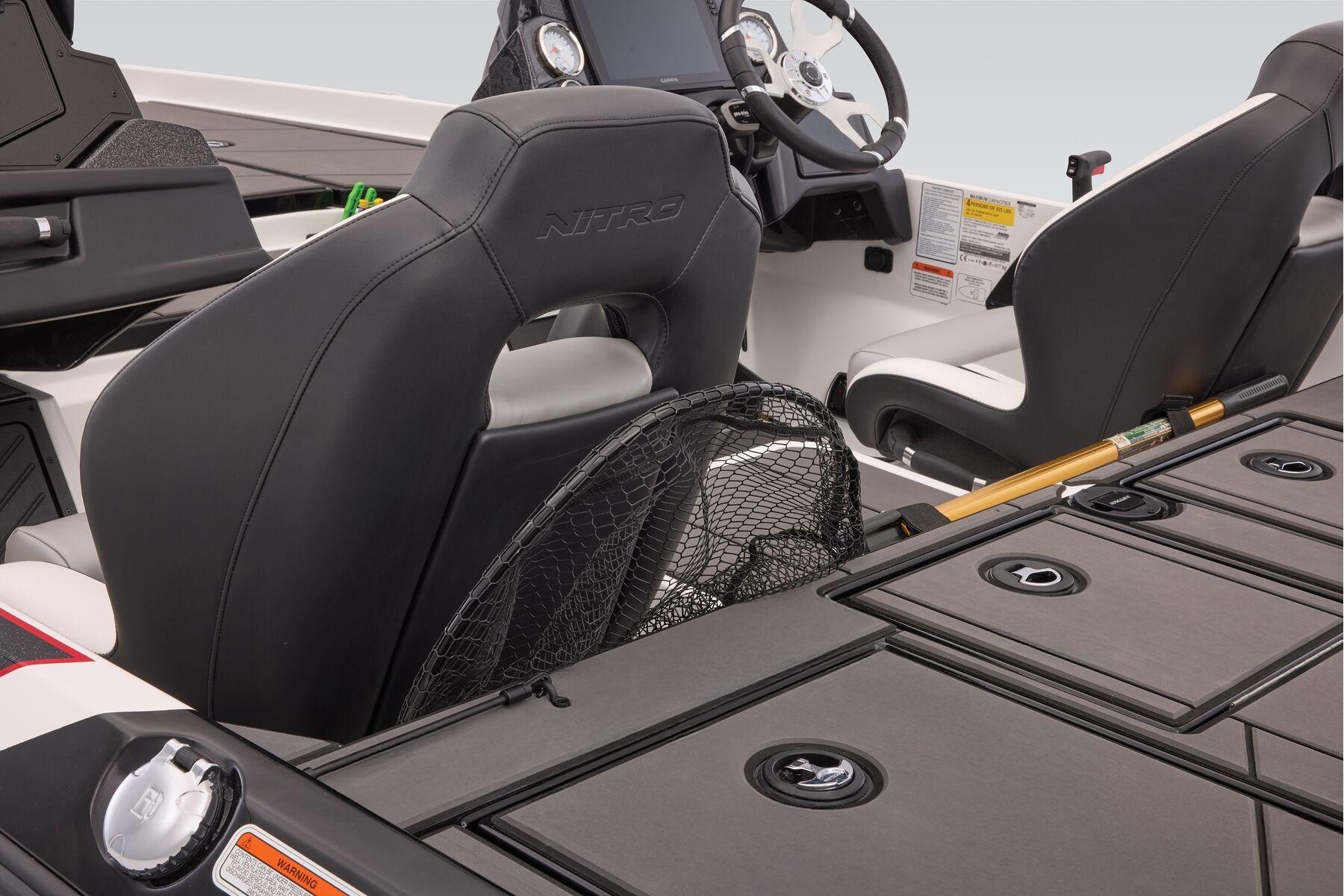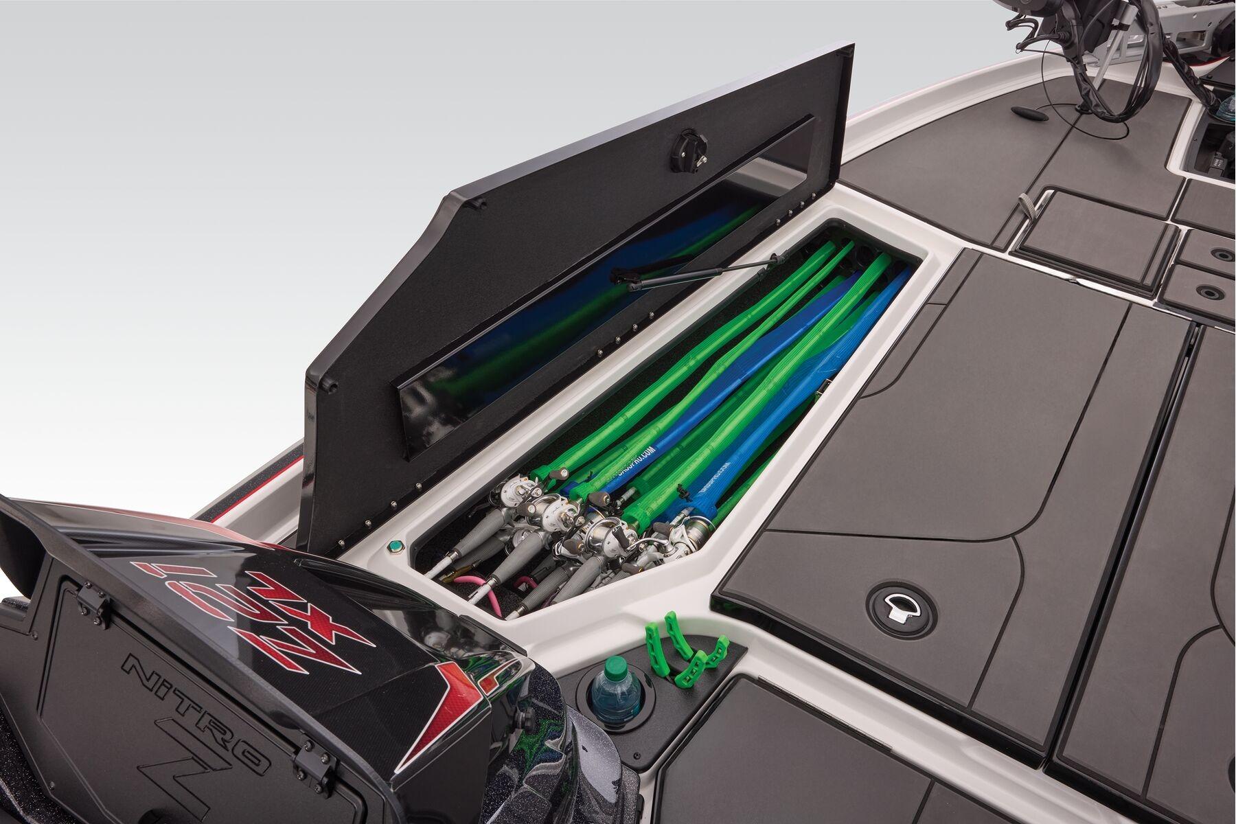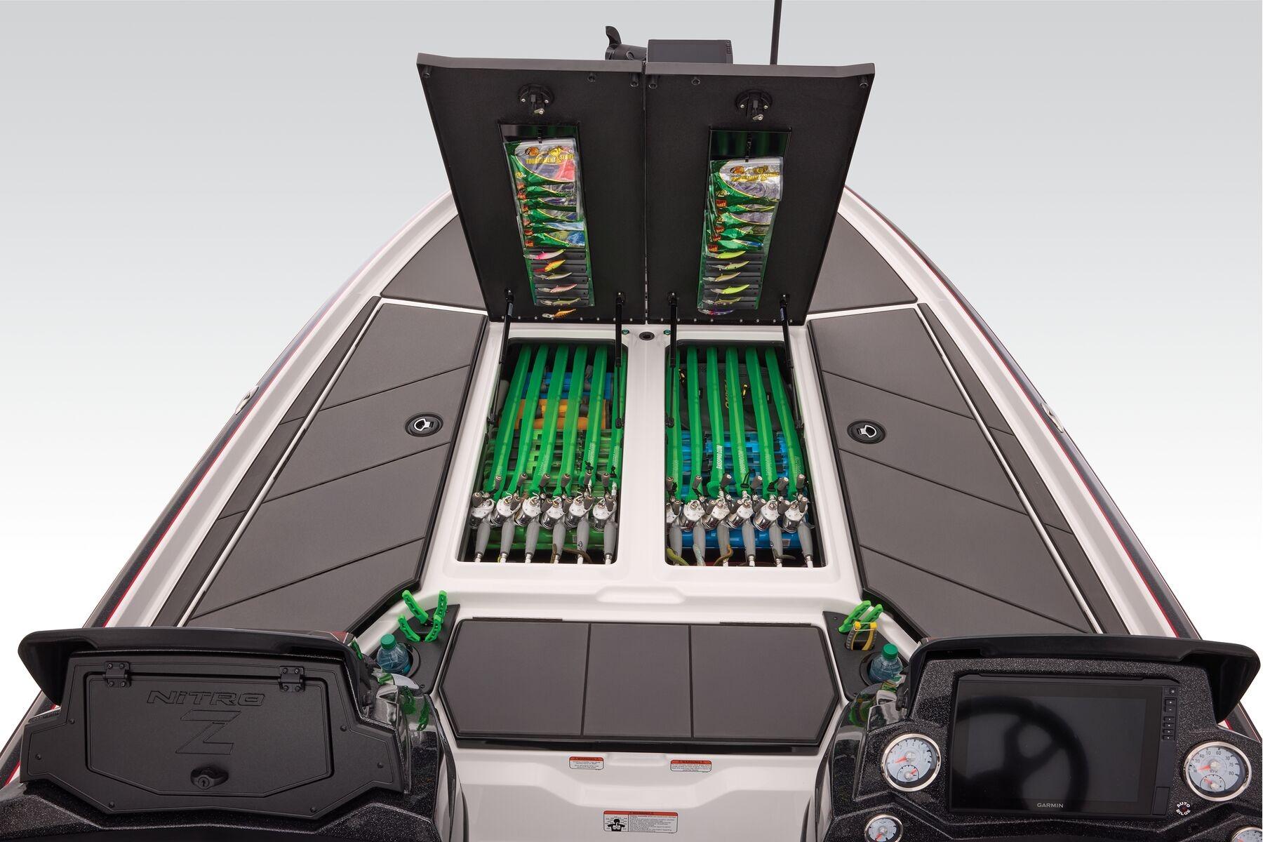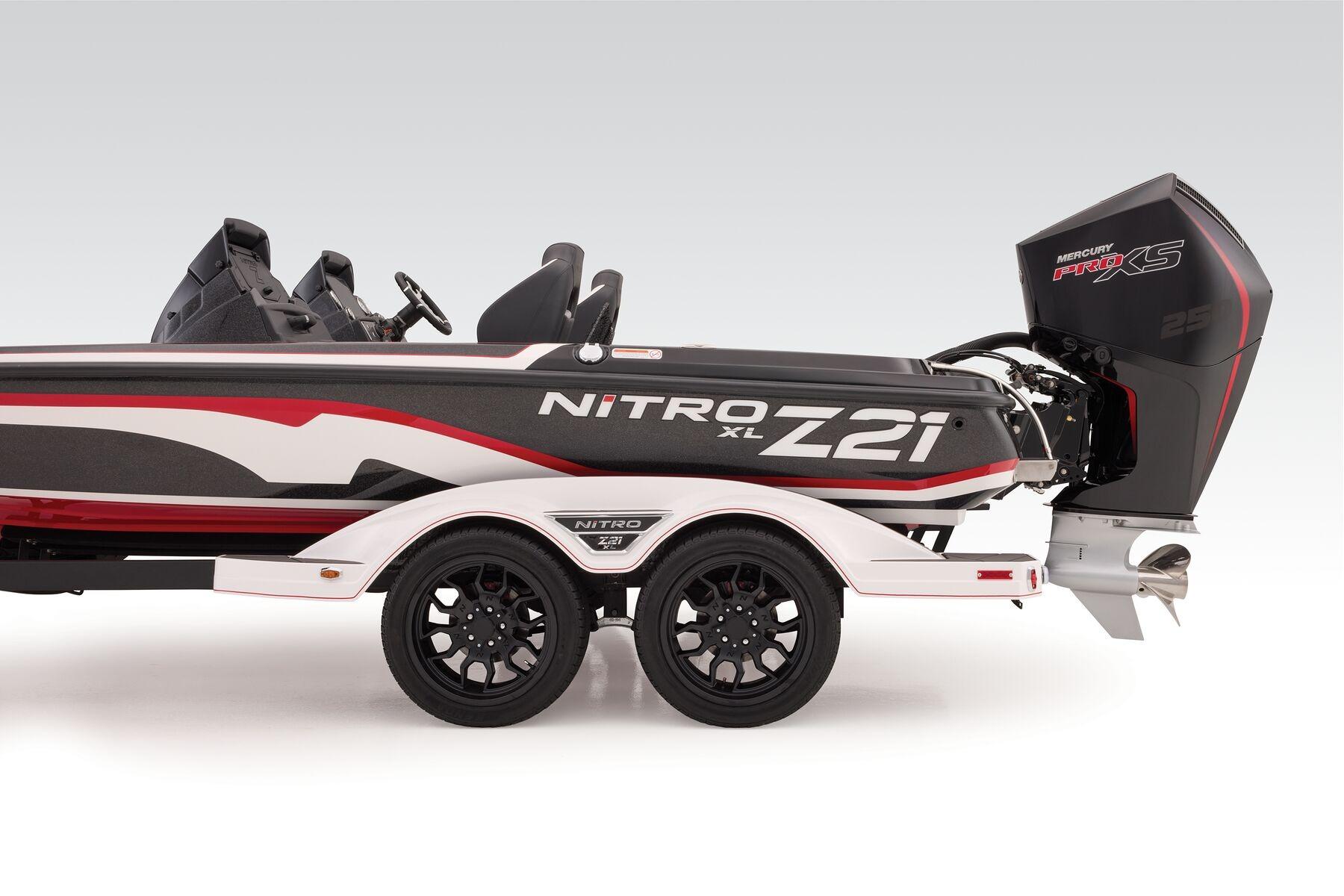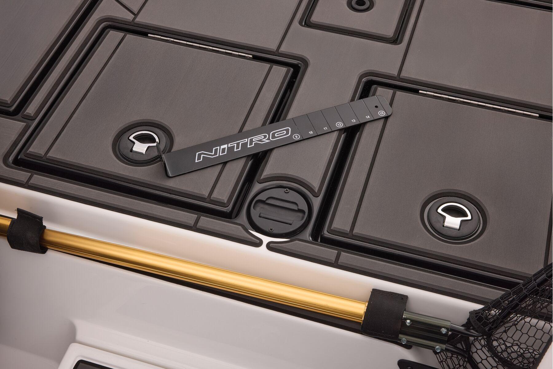 Sports car performance, sedan comfort, SUV utility. The NITRO® Z21 XL combines these and more into the ultimate no-holds-barred bassin’ rig. In the 21-foot class, the Z21 XL stands alone in performance-driven fishability with a colossal casting deck, pro-driven layout, and all the fishing features demanded by the top pros. Up front, an extra-wide bow gives you more stability on the trolling motor, and you’ll be at your best all day thanks to the padded front deck. The colossal center stows carry both rods and tackle in organized security and are accessible at a moment’s notice. All-new slam latches mean no more twist latches to trip over when left undone. Underfoot in the cockpit is an EVA foam pad for fast-drying non-skid grip, while the helm is an angler’s dream, carrying electronics up to 16”, a full gauge set, and the NITRO® Z-TOUCH™ touchscreen control center. Z-CORE™ suspension seating saves your back in chop and keeps you centered in high-performance turns thanks to the side-bolstered design. The running surface of the Z21 XL features NVT™ technology for instant planing, nimble handling, and superior speeds with a full load. Our engineers focused on real-world tournament conditions to deliver a better experience with a full load, fishing partner, full livewells, and a full complement of gear to give you the pro-grade experience you’ve been looking for.
