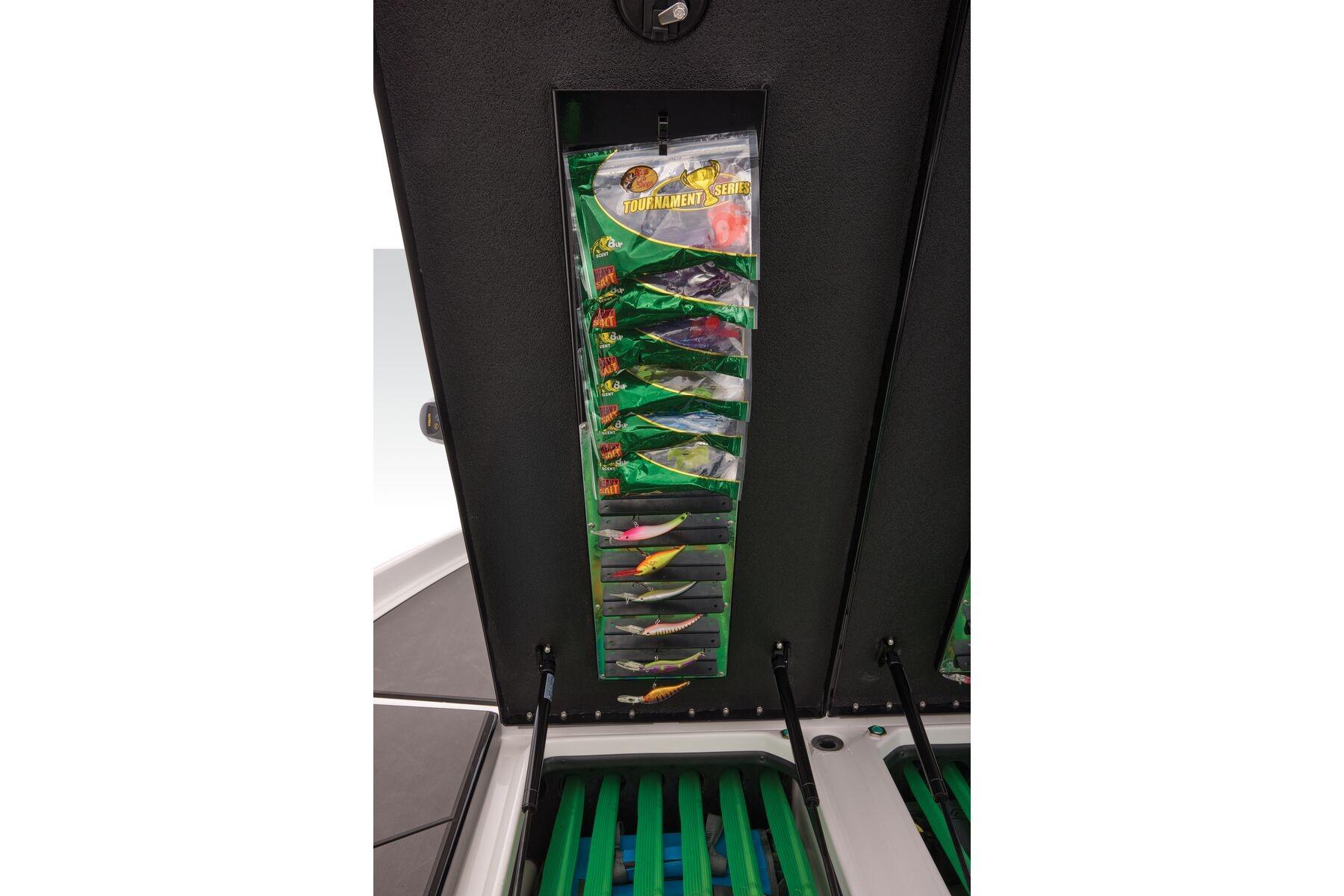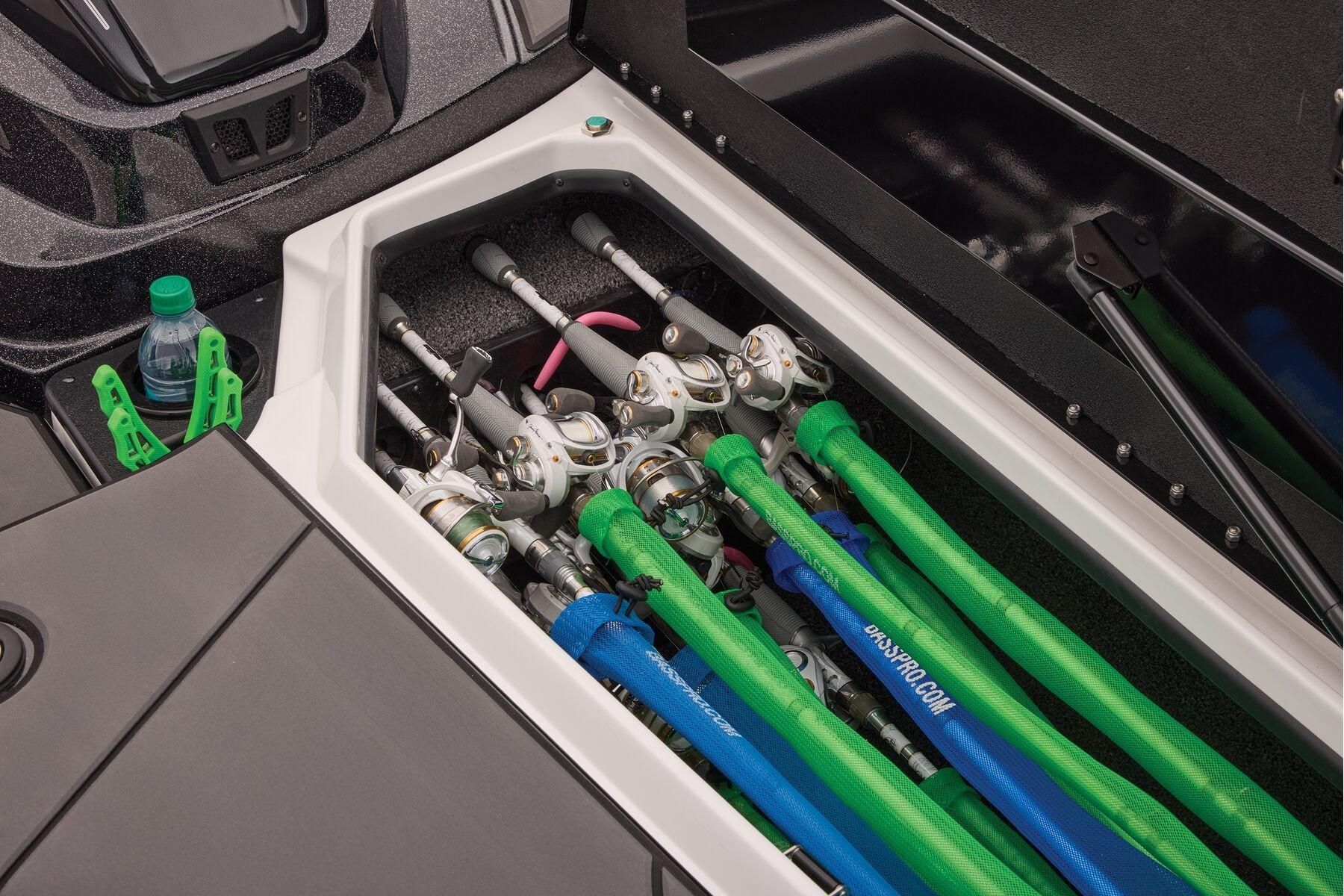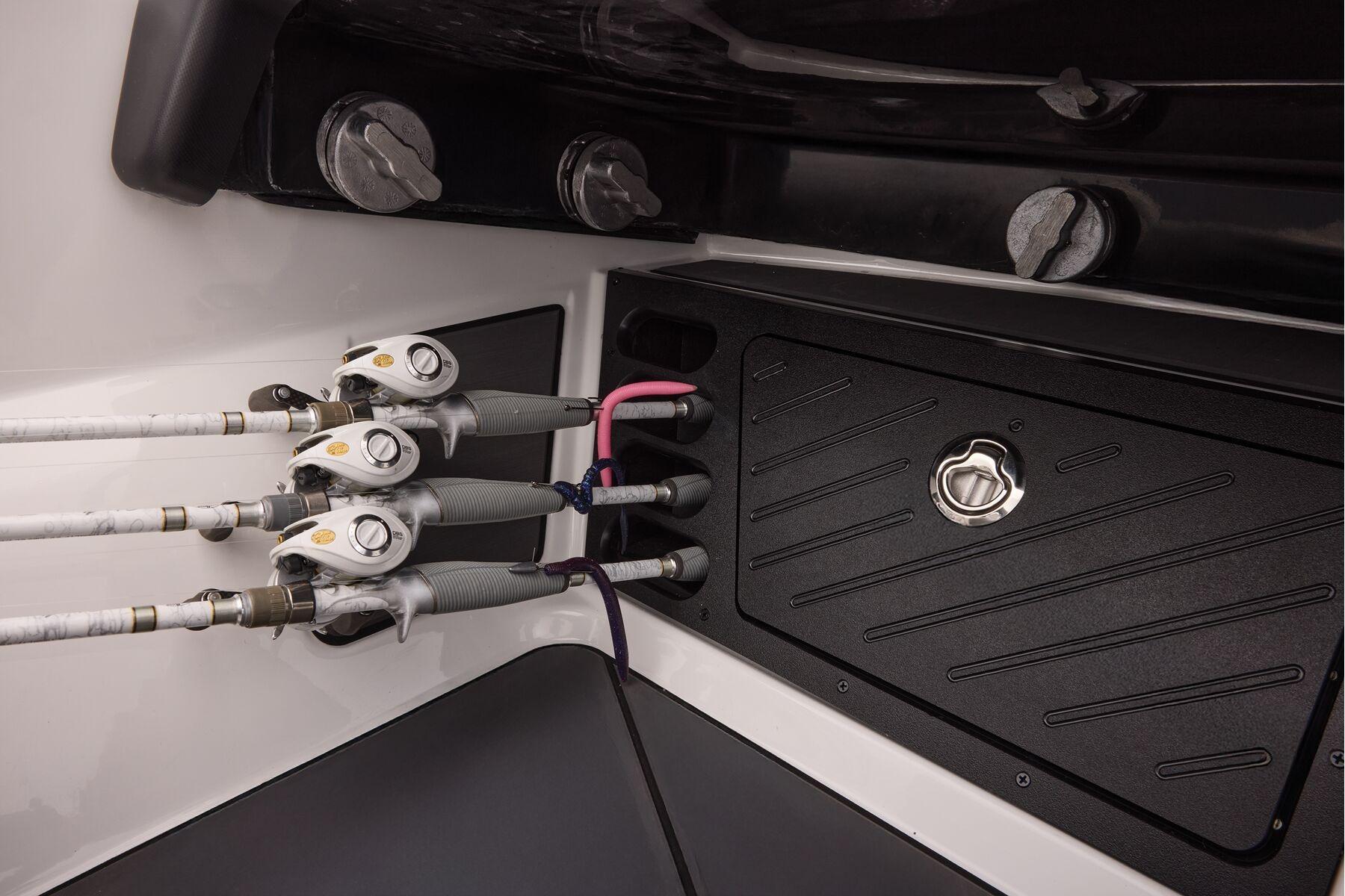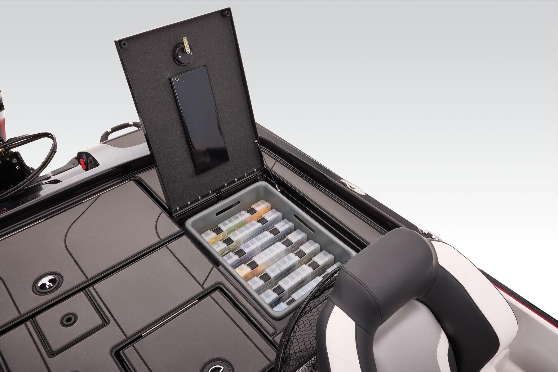 Oversized, lockable bow port & starboard rod lockers w/lift assists for rods up to 8' (2.44 m) & 23 tapered tubes in port locker