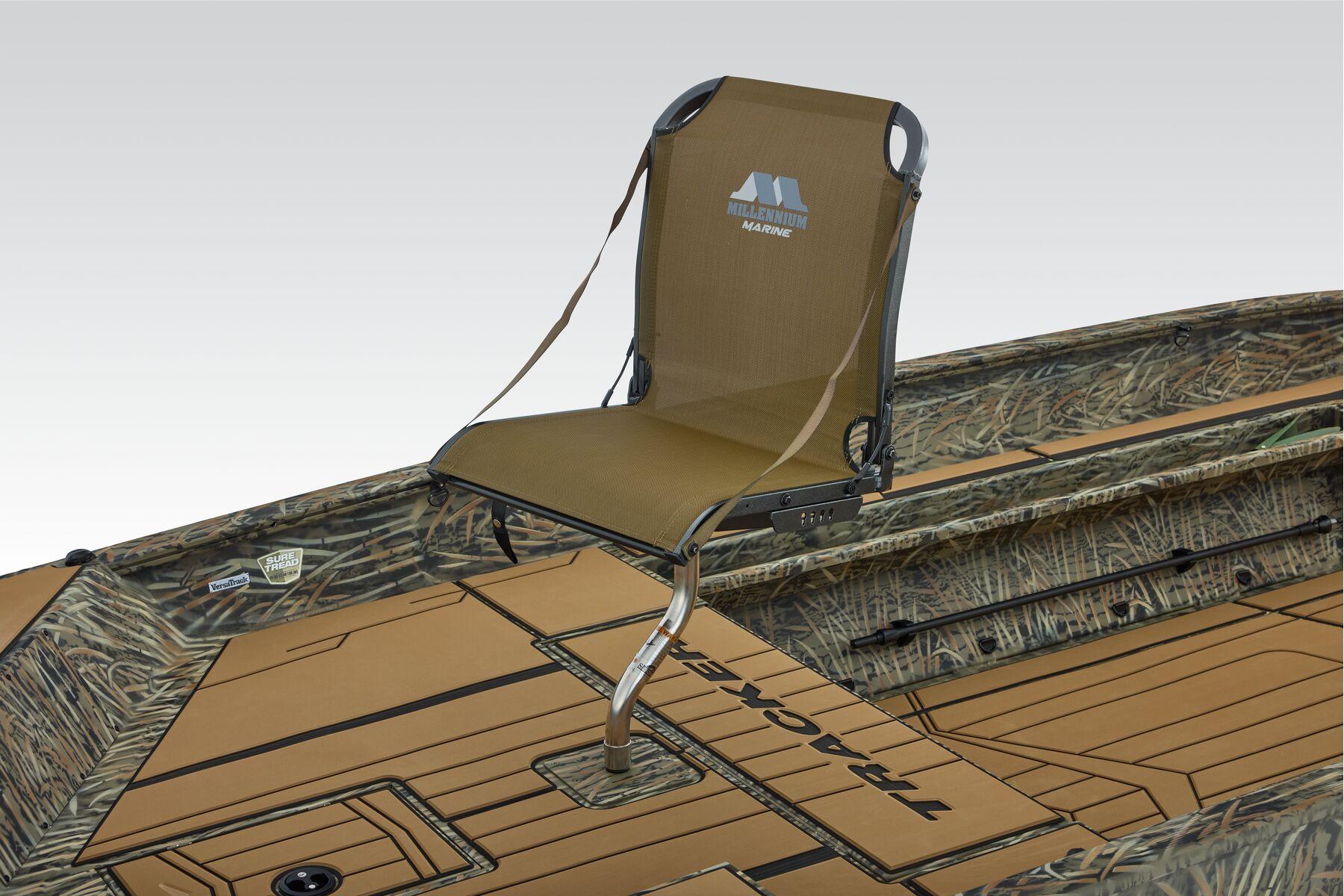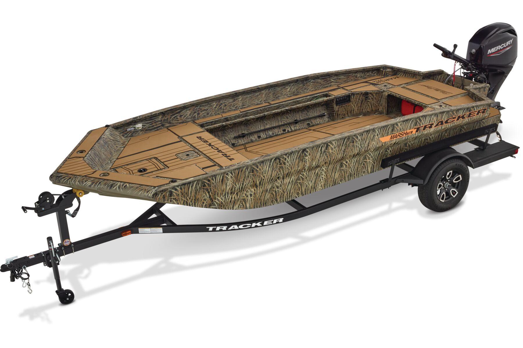 Designed for versatility, it features a spacious front deck ideal for duck hunting, multiple lockable storage compartments, and dry storage in the aft port seat pod. The interior includes Sure Tread™ non-skid flooring for safety and longevity, along with strategically placed tie-down points for gear security. The exclusive VERSATRACK® accessory channel allows customization. Constructed from 100% aluminum with a wood-free transom system, it provides a smooth, dry ride thanks to its 7° deadrise and icebreaker keel. Additional features include integrated spud pole tubes, rear transom steps, and a welded foam-filled interior for strength. Equipped with practical electrical components and a powder-coated trailer, this boat is perfect for die hard waterfowl hunters, and outdoor enthusiasts seeking durability and style in striking Forest Green or TrueTimber® camo patterns.
